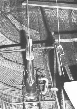 Tandis que l'on met en place les travaux de la coque, on fixe des tiges de suspension règlables entre l'IPN de la charpente et les entretoises supérieures des membrures pour soutenir l'ensemble et pour affiner le positionnement des éléments (Réf. Fig. N°11). C'est pourquoi il est important que l'élément auquel on accroche les tiges de suspension ne puisse absolument pas se déformer au cours de la construction de la coque.