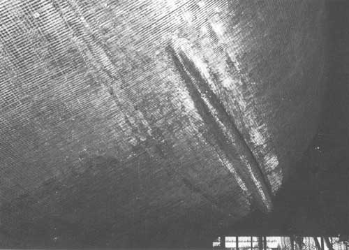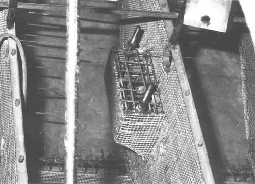 Plus tard dans la construction, la face interne de l'étrave sera grillagée et agrafée après que des trous d'accès pour l'aiguille vibrante auront été pratiqués dans la tige centrale de rablure à certains endroits pour permettre un remplissage parfait quand l'étrave est vibrée pendant la coulée.