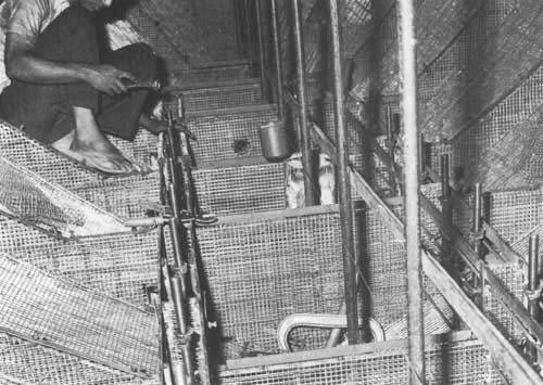 L'équipe intérieure coule le mortier à l'intérieur du grillage entre les zones vibrées et suit l'équipe de vibration pour réaliser une surface assez régulière à l'intérieur de la coque prête pour l'enduit final par les cimentiers..