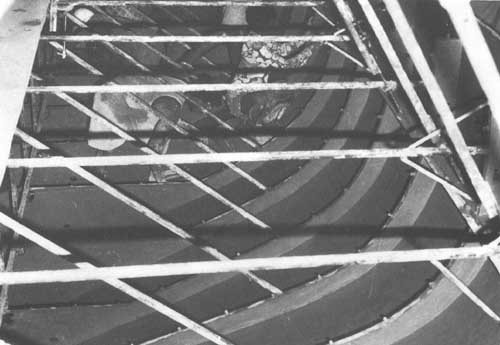 Les bordures amovibles des anguillers, dalots, porques et varangues, entretoises de membrures, cornières de livet de pont et de bauquière peuvent maintenant être enlevées, après avoir dégagé les tiges de suspension. Elles sont nettoyées et rangées pour être utilisées sur des constructions prévues pour plus tard. Les dessus des bâtis de moteur et des paliers sont desserrés pour vérifier qu'il n'y a pas de trous dans la surface et les boulons sont graissés à nouveau. Les brides de la chemise d'étambot sont nettoyées afin d'être prêtes pour le montage du tube d'étambot.