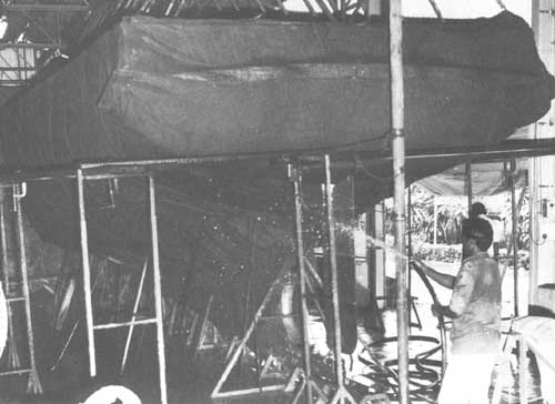 La totalité de la coque - intérieur et extérieur - est enveloppée dans de la toile à sac qui doit demeurer en contact étroit avec la surface du ferrociment. La toile est entièrement trempée d'eau jusqu'à saturation. Après le trempage initial, la coque aura besoin d'être arrosée à intervalles réguliers, nuit et jour, pour maintenir l'humidité.
