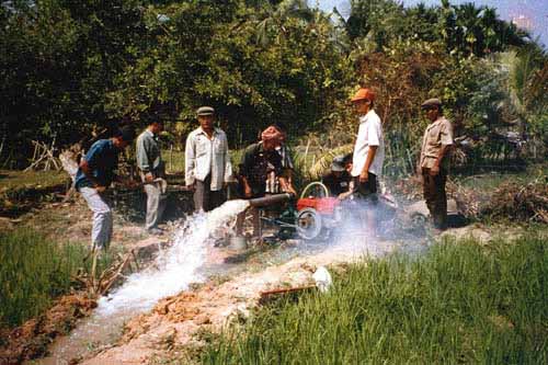 Hydrology technician explaining the use of a motor pump to supply additional irrigation to farmers in Cambodia.