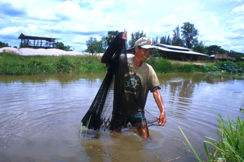 Model fish farm. Fish fry production: cast-netting in a shallow fish pond. Fish fry are produced for common carp, Chinese carp, tilapia and silver barb. Lack of mechanization and high cost of pond construction results in shallow seasonal ponds being typical of aquaculture in Laos. The project organizes training of farmer groups in improved production techniques that take into account the climatic and economic conditions of their provinces.