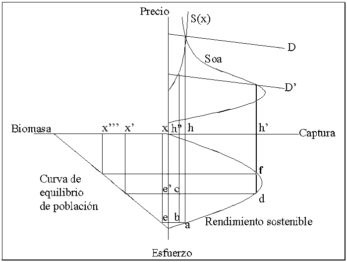 Suponiendo que el equilibrio inicial del nivel de captura (h), el nivel de esfuerzo (e) y el tamaño de equilibrio de la población (x) se produce en la Figura 1 cuando la función de suministro en libre acceso (Soa) es igual a la demanda (D), entonces la función de suministro con población constante correspondiente al tamaño de la población (x) es S(x), que intersecta la curva de la demanda (D) en su intersección con Soa. Una reducción del precio de mercado se representaría mediante el cambio de D a D', lo que haría que el nivel de captura equilibrado a largo plazo aumentaría hasta h'. No obstante, a corto plazo, la captura disminuiría a h'' mientras D' y S(x) son iguales. Como la captura potencial (h) es mayor que la captura real (h''), el exceso de capacidad existe para este nivel de esfuerzo (e) y tamaño de población (x).
