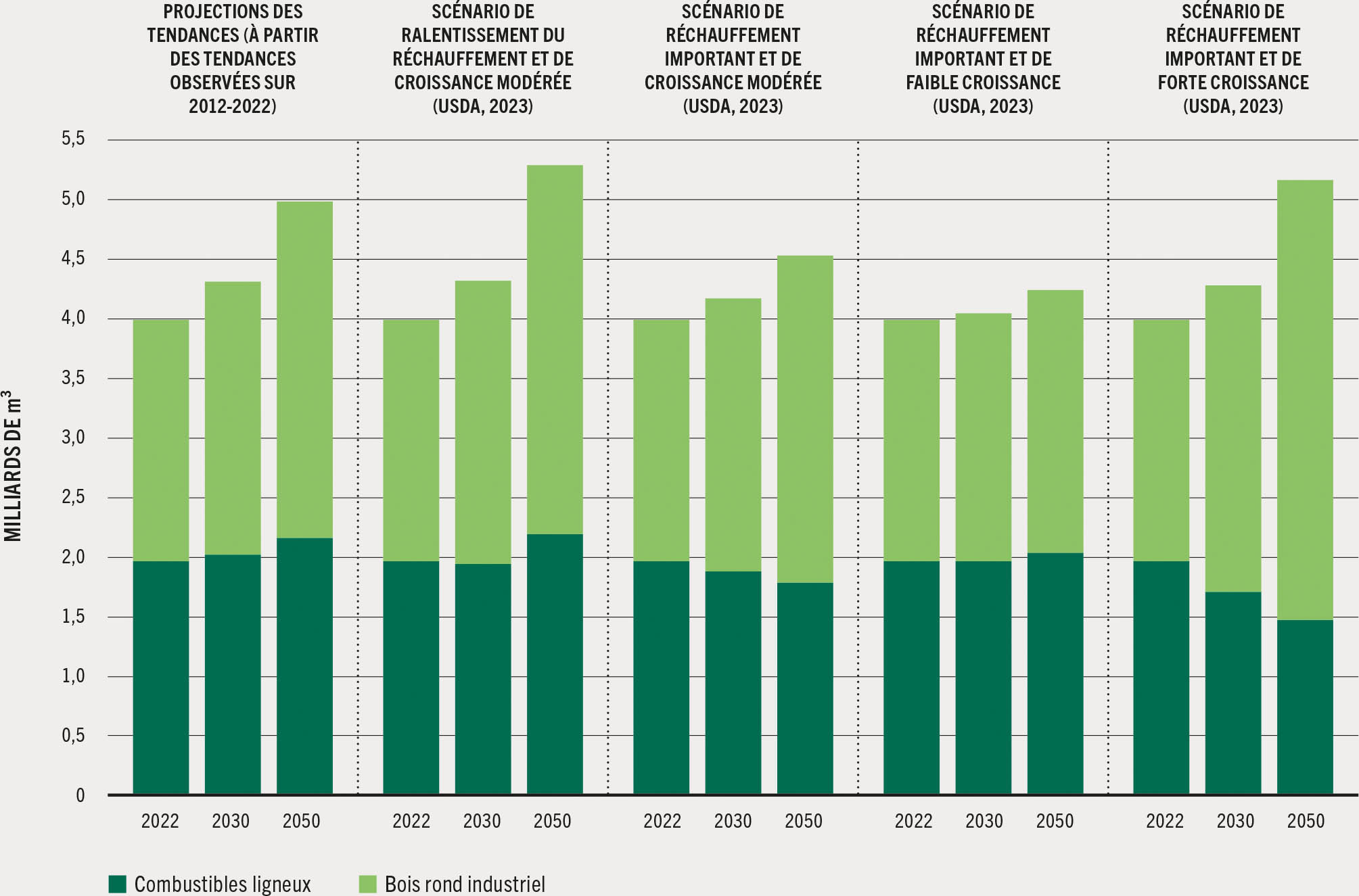 L’édition 2022 de La Situation des forêts du monde comprenait une analyse du rôle futur potentiel du bois dans la bioéconomie. Depuis, le Département de l’agriculture des États-Unis (USDA) a effectué de nouvelles projections de la demande mondiale de bois rond et de produits forestiers en appliquant le modèle FOROM (Forest Resource Outlook Model, modèle d’évolution des ressources forestières). Les projections sont réalisées pour quatre scénarios de réchauffement climatique et de croissance économique – 1) ralentissement du réchauffement et croissance modérée; 2) réchauffement important et croissance faible; 3) réchauffement important et croissance modérée; 4) réchauffement important et croissance élevée – fondés sur les quatre «profils communs d’évolution socioéconomique54» du Groupe d’experts intergouvernemental sur l’évolution du climat, qui retiennent comme hypothèse de départ différentes politiques climatiques.