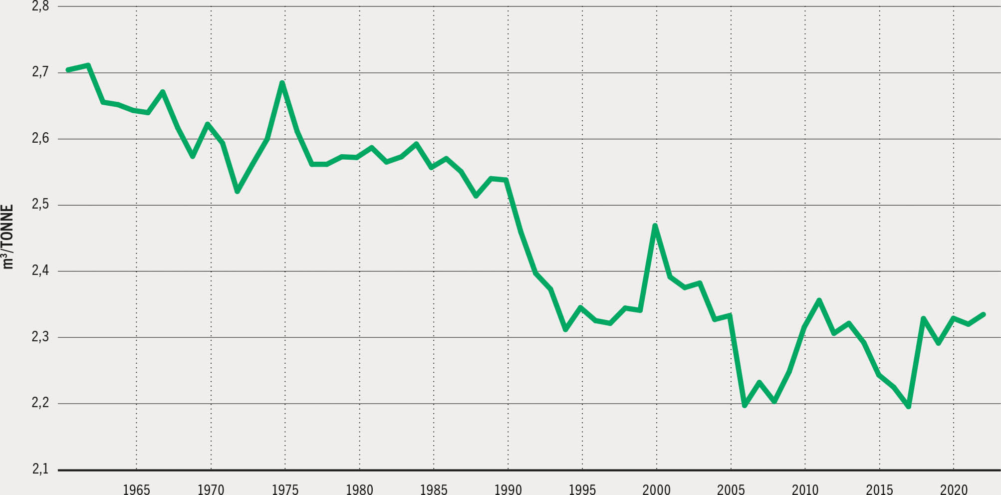 FIGURE 6Efficacité de l’utilisation des ressources pour le bois rond industriel, 1961-2022