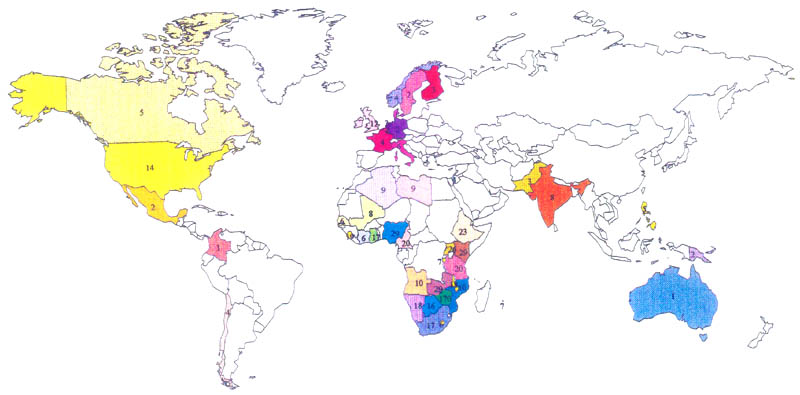 (Numbers reflect the number of times document packages have been sent by Alcom Information Service to respective countries)