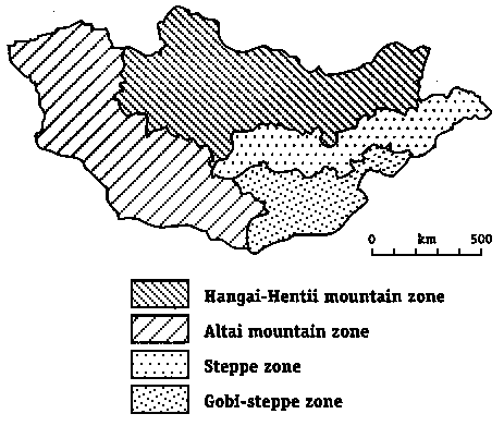 ON THE BASIS OF ECOLOGICAL CONDITIONS, geographical boundaries and herding practices, four major ecological-territorial zones can be distinguished in Mongolia: the Hangai-Hentii mountain zone, the Altai mountain zone, the Steppe zone and the Gobi-steppe zone