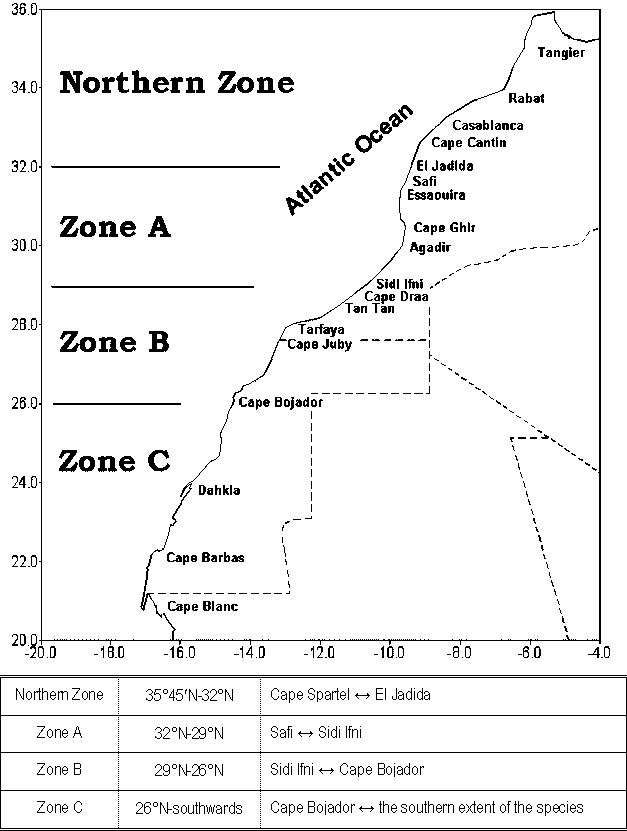 Figure 1 shows the fishing zones of sardine off the Northwest African coast. The migration pattern of sardine in zones A (32oN - 25oN) and B (29oN - 26oN) have been studied using information from the activities of the commercial fleet and results from acoustic surveys (Belvèze and Erzini, 1983). At the end of autumn and beginning of winter, a perpendicular movement of sardine towards the coast is observed when spawners move inshore to spawn. A seasonal movement of sardine along the coast is also observed.