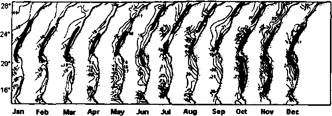Dans la zone méridionale B et la zone C (28°N-16°N), les sardines sont distribuées à des profondeurs entre 20 et 200m, alors que différents bancs individuels ont été enregistrés dans la couche pélagique à des profondeurs de 200 à 500m. Pendant la période automne-hiver les niveaux de profondeurs sont beaucoup plus étendus que pendant la période printemps-été.