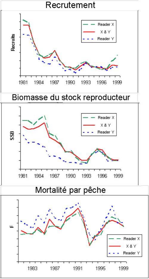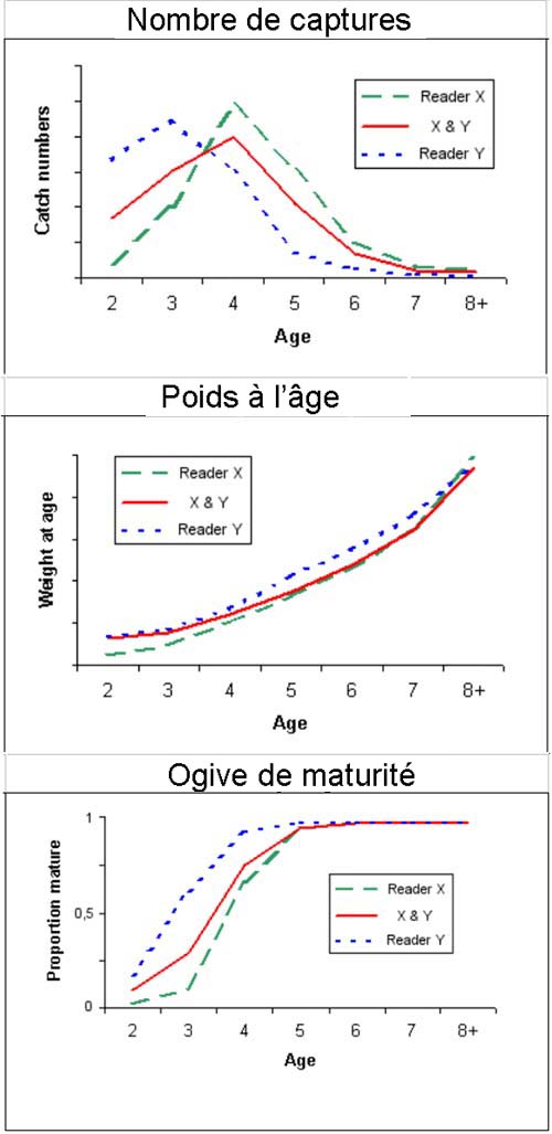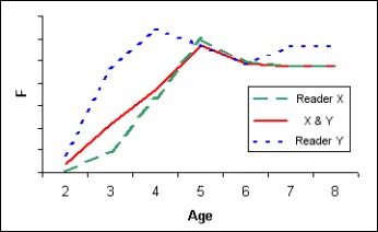 Le régime de pêche est très différent dans chaque cas, comme il est montré à la Figure 7. Les déviations dans les régimes de pêche sont élevées pour les groupes d'âge jeunes parce que le lecteur Y a tendance à assigner un âge plus jeune à un poisson donné que le lecteur X.