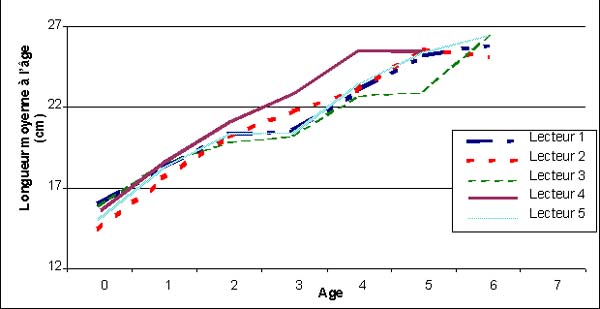 La longueur moyenne à l'âge de l'échantillon de l'atelier par le lecteur est présentée à la Figure 4. Pour les âges 0, 1 et 2 tous les lecteurs estiment la même longueur. Pour les âges plus élevés, le lecteur 4 estime une longueur à l'âge plus élevée que les autres lecteurs, en raison de la sous-estimation d'âge à laquelle on a fait référence au Tableau 3. On a observé quelques différences pour les âges 3 à 5.