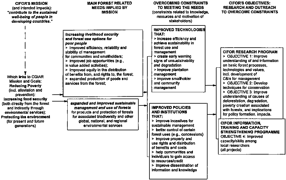 CIFOR's four objectives are listed in Column 4 of Figure 2.1 under the two major programmatic headings of research and outreach activities (information, training, and capacity strengthening). Through meeting these objectives, CIFOR contributes towards removing the constraints to meeting the needs implied by its mission and the goals of the CGIAR.