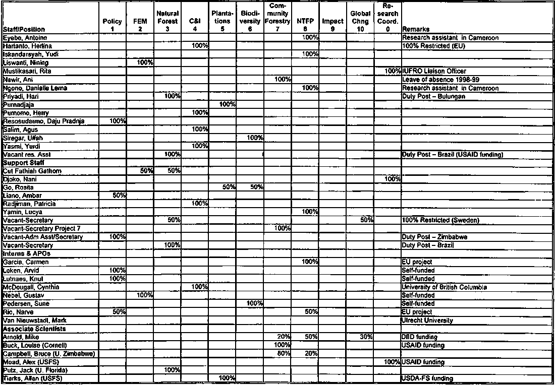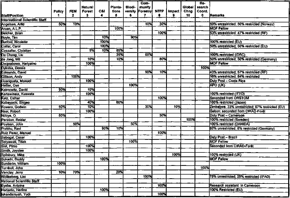 The current ten project structure is a flexible one, as would be expected, given the highly integrative and collegial structure being sought by the BoT and the DG. As such, while the ten projects exist as separate entities and have their own strategy papers, sets of activities, and internal organizational arrangements, their activities could be better integrated in many cases, and the researchers involved in the projects are not in the majority of cases responsible to only one project. Thus. out of the internationally recruited scientific staff that are not on secondment to CIFOR or on 100 percent restricted project funding from a given country/organization, almost two thirds are assigned to two or more projects (see Tables 2.2 and 2.3).