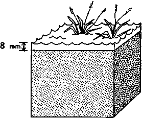 How much and how often water has to be given depends on the irrigation water need of the crop. How to determine the irrigation water need has been discussed in Volume 3. The irrigation water need is defined as the crop water need minus the effective rainfall. It is usually expressed in mm/day or mm/month. When, for example, the irrigation water need of a certain crop, grown in a hot, dry climate is 8 mm/day (see Figure 1), this means that each day the crop needs a water layer of 8 mm over the whole area on which the crop is grown. This water has to be supplied by means of irrigation.