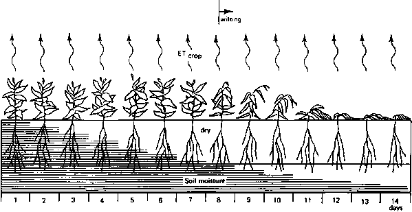 If it is assumed that the soil is wet (e.g. at field capacity) on day 1 (see Figure 3), the crop will have no difficulty in taking up the water for the first couple of days. When, however, more and more days pass - and no irrigation is given - the crop will have more and more difficulty in taking up the water.