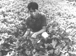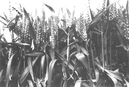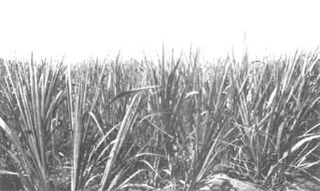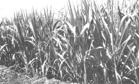An example of the plant observation method is given in Figures 9 and 10. The sugarcane in Figure 9 suffers heavily from water shortage: the leaves are stiff (bent towards the centre) and curled. Figure 10 shows the same sugarcane when enough moisture is available: the lower leaves are hanging, thus exposing them fully to the sunlight and allowing maximum evapotranspiration (water use of the plants) and crop production.