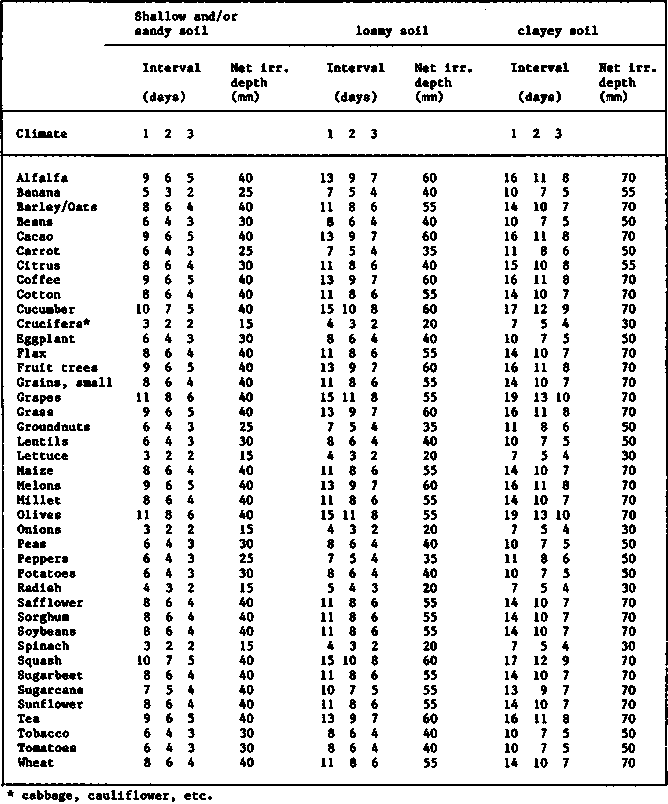 In this section, a table is provided to estimate the irrigation schedule for the major field crops during the period of peak water demand; the schedules are given for three different soil types and three different climates. The table is based on calculated crop water needs and an estimated root depth for each of the crops under consideration. The table assumes that with the irrigation method used the maximum possible net application depth is 70 mm.