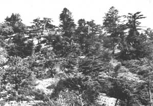 - Cyprès et genévriers, quelquefois associés avec Pinus halepensis aux altitudes les plus basses. On rencontre les cyprès sur les sols calcaires et très secs, tandis que les genévriers paraissent préférer les grès. Leur hauteur peut atteindre environ 25 m.Au-dessus de cette altitude commencent les forêts de sapins et de cèdres, qui étaient probablement autrefois les principales associations climatiques du Liban, en mélange avec des cyprès et des genévriers.
