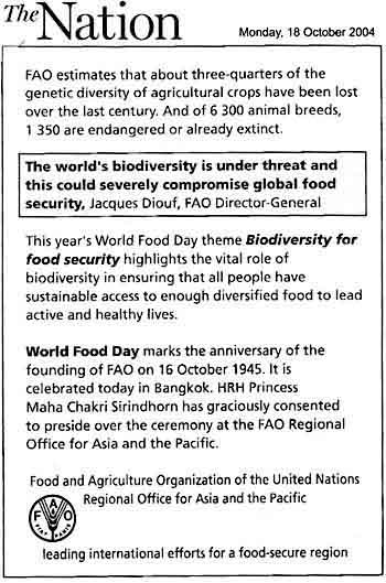 FAO celebrates World Food Day 15 October 2004 FAO celebrates World Food Day THE Food and Agriculture Organisation (FAO) in cooperation with Lao Government, held a celebration to mark World Food Day last Thursday. World Food Day falls on 16 October, and has been celebrated annually since its establishment 59 years ago. This year, the theme of the celebration was Bio-diversity for Food Security. It focuses on how combinations of multiple quality foods can help people lead active and healthy lives. The celebration was attended by Minster of Agriculture and Forest Sieng Saphengthong and officials from various ministries and NGOs. Lao PDR is ranked one of worlds top ten centres in terms of bio-diversity. The Lao people make extensive use of this diversity in agriculture, which is the most important economic sector in the country, according to FAOs press release. In Laos, the most important crop is rice. In terms of crop area, it represents 80 per cent of the agricultural landscape and in terms of food energy, it accounts for about 80 per cent of total calories intake for most people. According to research data, there are more than 3,000 varieties of cultivated, wild and weedy rice from the provinces. Glutinous sticky rice, the major staple of the Lao diet, accounts for 85 per cent of the varieties. On the other hand, livestock and poultry form an important source of protein and energy to complement the rice-based diet, while foods gathered from the forest provide vitamins and body-protection nutrients. Over 700 species of wild plant are exploited for food and other uses in the Lao PDR. Of the more than 1,400 species of wild animal identified in the country, 90 percent are used in some way by local people. Aquatic life provides another essential protein food source, making up 43 percent of total animal product consumption. Conserving agro-biodiversity requires joint efforts by the government and international development partner, in order to preserve the environment, provide education, expand action research and ensure commitment to allocate resources. FAO has been leading the development of a national agro-biodiversity programme for the Lao PDR with multiple partners. Many Lao people still suffer from hunger and micronutrient deficiencies. Studies have indicated that just under half of children suffer from chronic malnutrition and 13 per cent of adults are chronically undernourished. We need to do more to provide home gardening, food preparation, food handling and food safety advice for men and women, boys and girl, and to included basic nutrition in all training and extension curricula, from village literacy programmes all the way to college 0 level education. We need to keep in mind the World Food Summits objectives and the Millennium Development Goals - to reduce the number of hungry people and have all the people of the Lao PDR free from hunger by 2015. Conserving biodiversity is a key ally in our efforts to fight hunger and malnutrition, and to promote food security, balanced nutrition and healthy livelihoods. Speech by Minster of Agriculture and Forest Sieng Saphengthong on World Food Day - Lao PDR is one country in the Southeast Asian region that has many forests with an ecological diversity that covers an area of 205 million ha. Laos is also abundant of natural resources - there is still a big area of cultivating land, many rivers and their tributaries constitute the main source of living for many plants, animals and various aquatic animals which is the basic resources for the socio-economic development and plays an important role in contributing to the GDP. The forest and fauna and flora also play a contributing role in food supply, bringing more revenue to the population, providing energy and creating places of living for not less than 80 percent of the rustic population who live nearby these resources. The wetland area covers 945 ha. All these mentioned elements constitute the fishery habitat for various aquatic animals such as traditional fishes, frogs, turtles, shells etc. which represent more than 50 percent of high protein food for the local consumption of the Lao population. Furthermore, the Lao PDR is also abundant in plants, wild and water animal species and we can count between 8,000 -11,000 plant species, 166 species of reptiles, 700 species of birds, 247 species of mammals and 1,200 species of traditional fishes in the Mekong River. The Government of the Lao PDR always attaches great importance to the sustainable development and the protection of environment. It has set up its political guidelines that the socio-economic development should be carried out parallel with the economic growth, the socio-cultural development and the protection of environment, the natural production should be transformed into goods production, the productivity should be increased parallel with the restoration of land, water sources, forests, in order to ensure the abundance of these resources and the sustainable protection of the environment. Furthermore, the Government has also applied the hand-over policy of the land and forest which will be conducted along with the agricultural production, the livestock farming, the reforestation, the protection of the forest and the promotion of sustainable use of wildlife, fauna and flora. The Lao multiethnic people will be ready, confident and easy to access, when needed, and will have the security from the foodstuff consuming. In order to manage efficiently the Agriculture and Forest work, the government of the Lao PDR has enacted different laws such as the Forestry Law, the Law on Water and Water Resources, the Law on land and the Law on Agriculture and different decrees to be used as reference to implement the Governments policy. Furthermore, the Government has also set up a strategic plan for the development of Agriculture and Forests, Biodiversity, Research, and Human Resources to be accomplished by 2020. Moreover, it has defined the area of 20 biolog