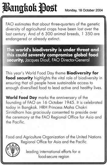 Thai farmer receives UN awards for improving livelihoods of others 20 October 2004 Section: General News - United Nations Food and Agriculture Organization (FAO) has awarded five Asian farmers, including a female Thai peasant, for improving the livelihoods of fellow villagers in their communities, the FAO said in its press release received here on Monday. Her Royal Highness Crown Princess Maha Chakri Sirindhorn, who was last week elected as the goodwill ambassador of the UN World Food Programme (WFP), presented the awards to the five Asian farmers at an event marking the celebration of the World Food Day 2004, held at the UN regional headquarters in Bangkok. These five farmers, who are four women and one man, are recognized for their marvelous agricultural practices and methods in different fields - highland farming, dry land farming, rice farming, fishing, and agro-forestry, said the press release. |
