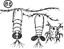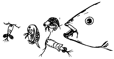| Agé de 1 à 7 jours, ils mangent des rotifères et d'autres petits animaux. Plus âgé, ils consomment surtout des microcrustacés planctoniques |