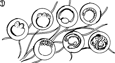 | Stade de l'oeuf : l'incubation dure de 2 à 6 jours selon la température de l'eau |