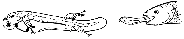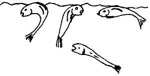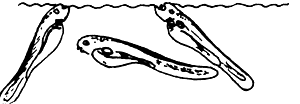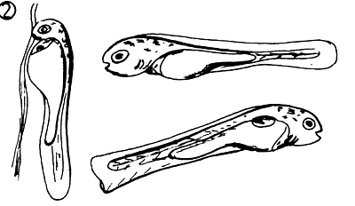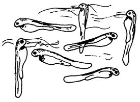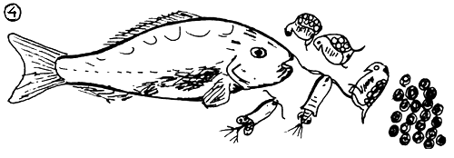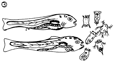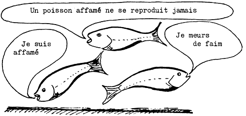 | (3) A la fin du troisième jour, les larves nagent bien. Elles commencent à prendre de l'air pour gonfler leur vessie natatoire. | (4) Le quatrième jour, elles peuvent commencer à se nourrir. |