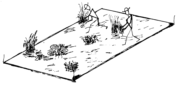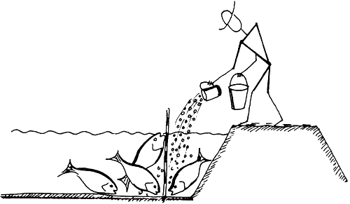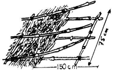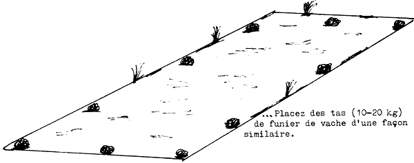 | (7) Laissez dissoudre du fumier de poule dans le fossé et mettez des tas de fumier de vache à la périphérie de l'étang …ou fixez des bottes d'herbes sèches le long des digues (Fiche 14). |