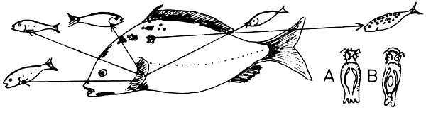 | …et surtout les vers des branchies, Dactylogyrus (a) et Gyrodactylus (b) |