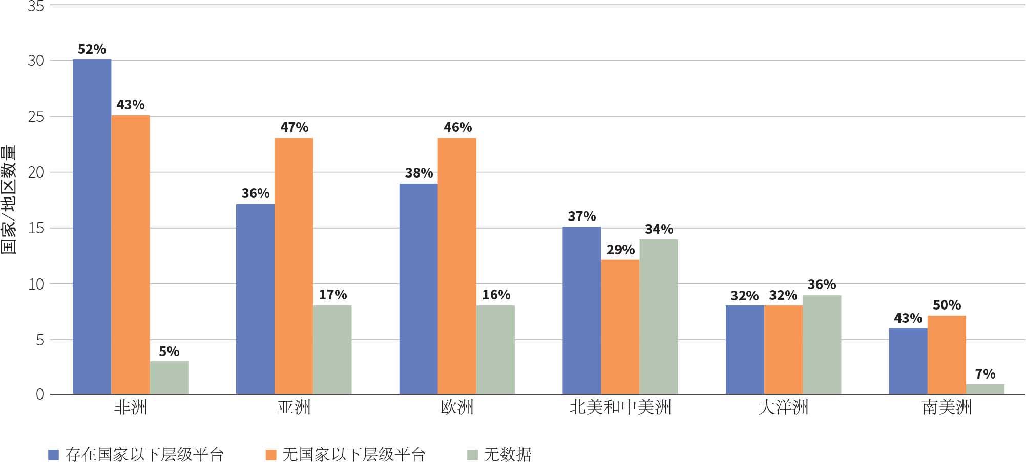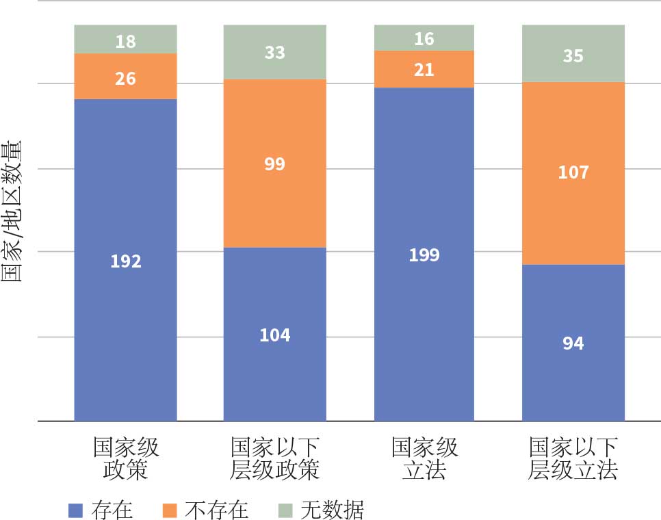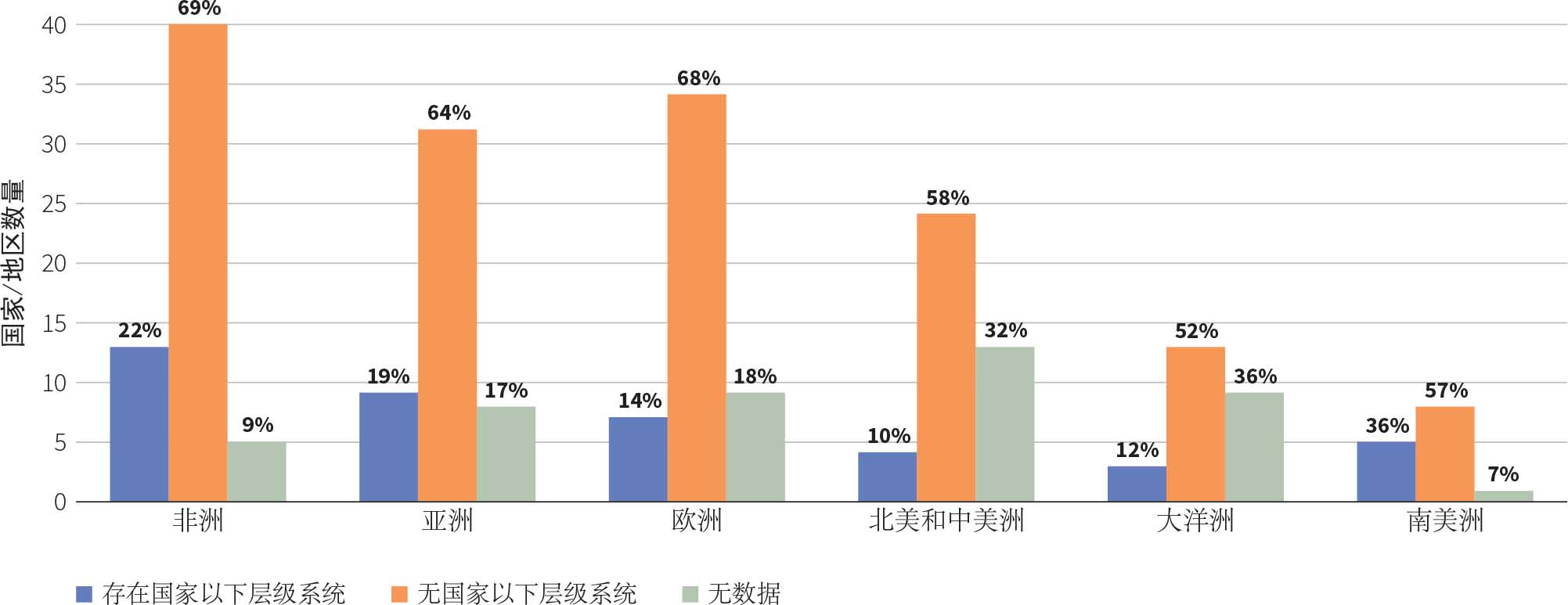 236个国家和地区中的约40%(98个国家和地区)表示尚未制定国家以下层级的可持续森林管理法规。一些国家和地区(例如圭亚那和马达加斯加)指出,支持可持续森林管理的政策法律是在国家层面制定,然后应用于国家以下层面和地方层面;还有一些国家和地区(例如新加坡)报告称,它们缺乏国家以下层级行政区划。