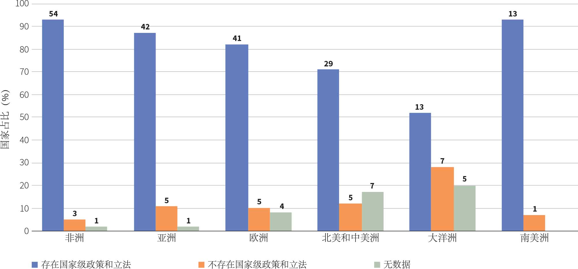 代表全球超过95%森林面积的192个国家和地区已制定支持可持续森林管理的政策和法律(图49)。覆盖面最高的是非洲、亚洲和南美洲,这些区域各有大约90%的国家和地区(非洲54个、亚洲42个、南美洲13个) — 约占全球森林面积的48% — 报告称其森林政策和立法已经到位(图50)。覆盖面之所以高,部分原因可能是近几十年来为制定政策和法律所做的工作,使习惯做法正式化,并在法定文书中更好地反映出来;也可能部分归因于通过将气候变化和性别等新出现的问题纳入政策和法律,以改善可持续森林管理并遵守与森林有关的国际承诺。