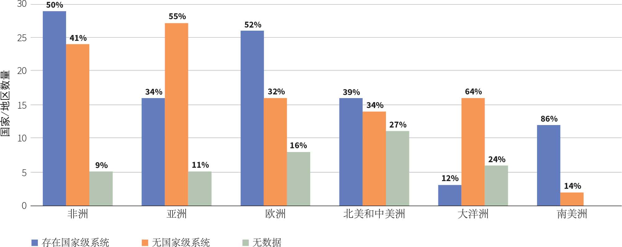 在各区域中,南美洲在国家级和国家以下层级建立木材产品溯源系统的比例最高(分别有86%和36%的国家和地区)。欧洲和非洲约50%的国家和地区有国家级溯源系统,亚洲(34%)和大洋洲(12%)的百分比较低。