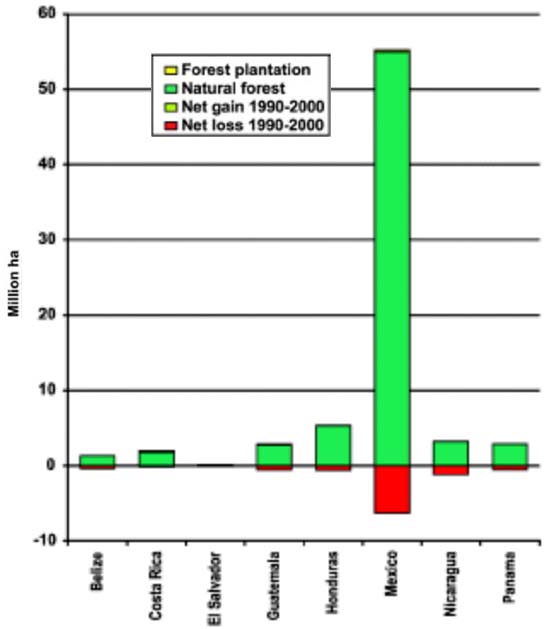 Source: Appendix 3, Tables 3, 4, 6, 7 and 9.The quality of information varies from country to country. Mexico has carried out systematic forestry inventories since the 1960s. The latest one was published in 1994 based on remote sensing images from 1993. Good, updated information on forest cover is available for Costa Rica, Guatemala and Honduras from detailed forest maps and forest inventories. Forest information for Belize and El Salvador was extracted from general land use maps. The estimates for Nicaragua and Panama were based on secondary sources.