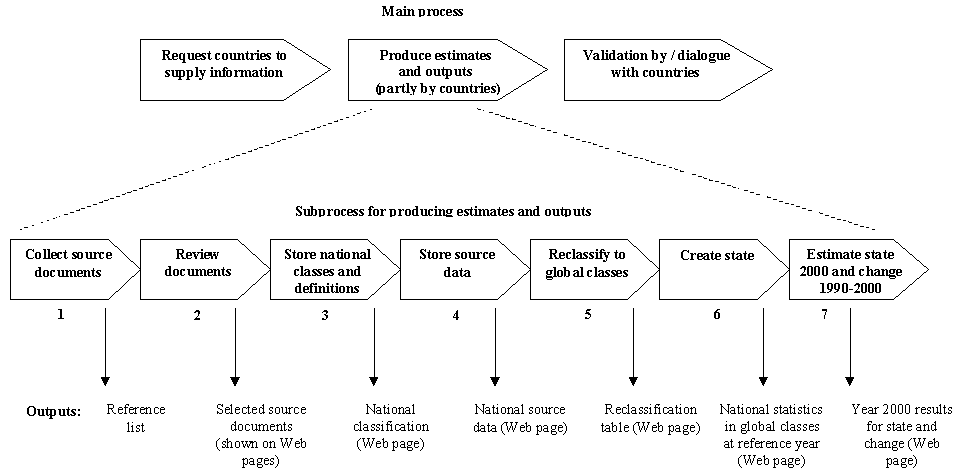 Step 5. To provide results that are comparable among countries, the national classifications had to be reclassified into the global classification scheme developed over past decades for the global assessments. For FRA 2000 reporting purposes, national data were reclassified into global land use classes. Definitions for these classes are given in Appendix 2. In most cases, the reclassification was simply a remapping to a corresponding global class, but sometimes national definitions overlapped with several global classes and the national class had to be split between two or more global classes.