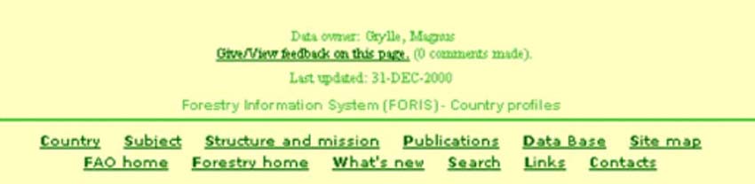 One important principle that FORIS supports is decentralized data ownership for core forest and forestry data. Obviously, forestry expertise and/or local knowledge resides with a wide range of FAO staff and partners depending on the subject and geographic location. From an organizational point of view, these persons (it is noted that a data owner should always be one person) also have technical responsibilities as focal points for a particular subject or a particular region. It seems that the most feasible way to maintain a wide range of forestry information for all countries is to have the system support the existing distribution of subject responsibilities and to provide tools to the respective officers (and to those to whom these officers delegate the hands-on work) for maintaining their information segment. For each page in the country profiles, the currently identified data owner is indicated in the footer, and readers can give feedback to these persons directly (Figure 48-4).