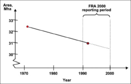 Step 7. The final step was to extrapolate the observed states from the reference years to the year 2000 and in the same process to estimate the area change between 1990 and 2000. As quality and availability of information varied greatly among countries, a unique analysis had to be made for each country. Area state 2000 and area change 1990-2000 were estimated for the total forest area, i.e. including closed natural forest, open natural forest and forest plantations together. The standard model was to use the two most recent states and make a linear extrapolation of the area to the year 2000. The slope of the line would then represent the rate of change between 1990 and 2000. This approach worked well when two comparable states were available, with reference years that approximately fit with the 1990s (Figure 48-7).