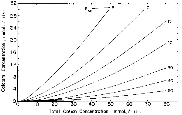 No procedure is given to evaluate sodium toxicity per se for field, forage and vegetable crops, in spite of the fact that sodicity tolerances have conventionally been given for them in terms of exchangeable sodium percentage (Pearson 1960; Bernstein 1974). The crop responses associated with sodicity levels in these and similar studies were likely a result of the way the experiments were carried out. An examination of the experimental data (Bernstein and Pearson 1956; Pearson and Bernstein 1958) shows that the yield reduction ascribed to toxic levels of exchangeable sodium only occurred when either Ca was in the deficient range (<about 1-2 mmolc/l) or the crop's salt tolerance threshold value per se was exceeded. Figure 7 (after Rhoades 1982) clearly shows that SAR at low levels of salinity cannot be increased without simultaneously reducing Ca concentration to nutritionally inadequate levels, or achieve high values of SAR while keeping Ca nutritionally adequate (> 1-2 mmolc/l) without also increasing total salinity to high levels. Sodium toxicity is apparently real for woody plants which do show sodium toxicity symptoms after sufficient accumulation in the plant tissue has occurred. Tolerance levels for these crops are given by Bernstein (1974).
