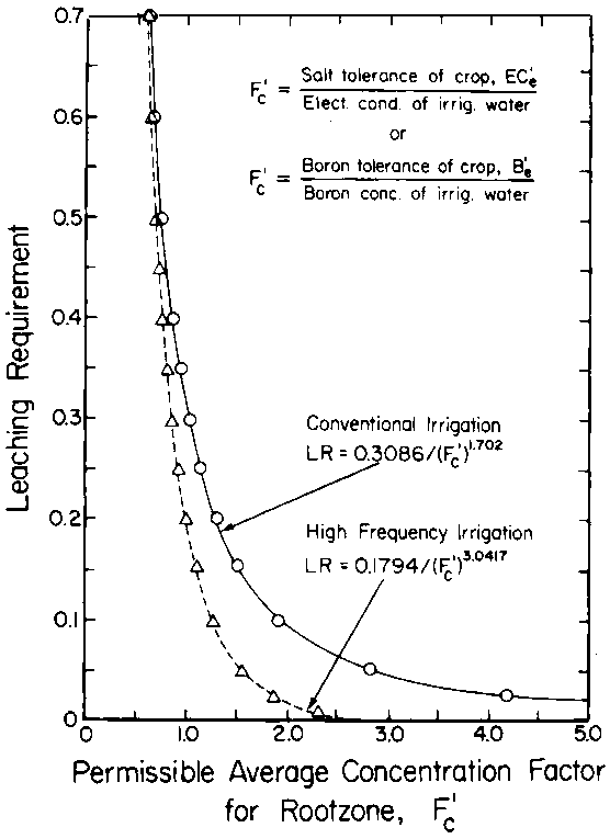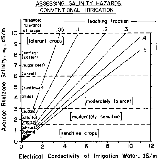 are given in terms of soil water at field capacity, some conversions in units are required before acceptability is evaluated. These various measures of salinity can be reasonably put on an equivalent basis for comparison using the relations: