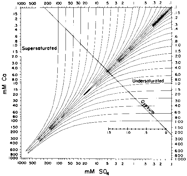 The concentrations of the major cations and anions in the soil water within an irrigated rootzone are predicted at equilibrium by Watsuit as a function of irrigation water composition, leaching fraction, soil CaCO3 presence or absence, and several alternative amendment treatments. Also predicted are SARsw, pH and ECsw, at the soil surface. Watsuit accounts for the precipitation and dissolution of important soil minerals (primarily CaCO3 and CaSO4 · 2H2O) on the composition of the soil solution within the rootzone. As discussed earlier, salt precipitation and mineral weathering can affect the levels of soil water salinity depending upon irrigation water composition and leaching fraction. The relative magnitude of such effects can be evaluated using Watsuit calculations. Details about the assumptions and relations that comprise this model are given in Rhoades (1972; 1977; 1984a; 1987b; 1988a) and Oster and Rhoades (1990).