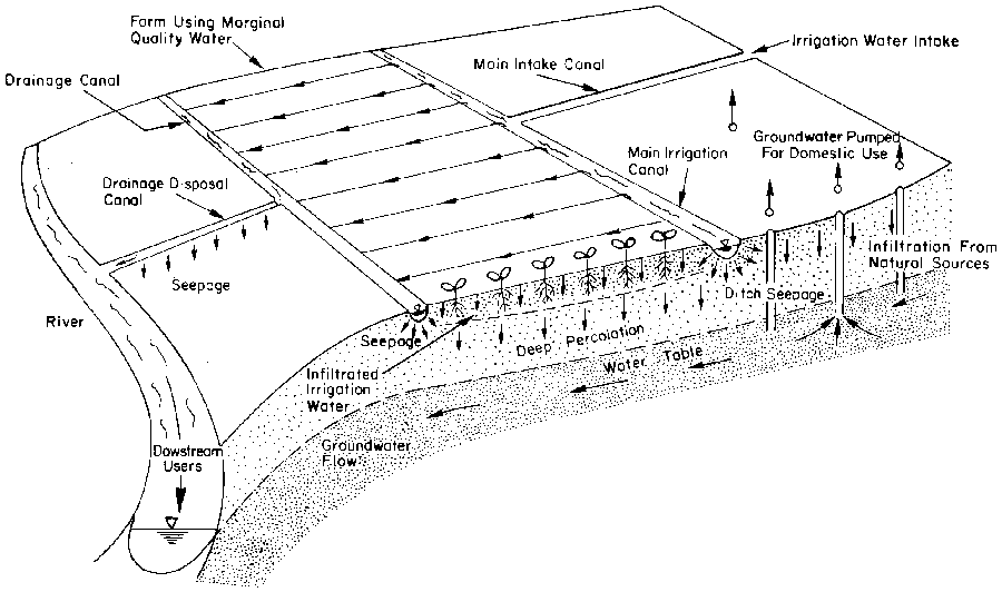 As explained above, water infiltrated into the soil in excess of that used by the agricultural crops passes beyond the rootzone. This water, together with that deep percolating from canal seepage, often dissolves additional salts (over and above those present in the irrigation water) from the soils and underlying substrata. Such mobilized salts, when transported to receiving waters, are a source of pollution, as are the salts applied in the irrigation water which have become concentrated in the drainage water through evapotranspiration. These saline drainage waters pollute good-quality receiving waters when they are allowed to mingle with them. Addition potential sources of pollutants from irrigation are the agrochemicals (fertilizers and pesticides) applied to the soils which may also be, in part, mobilized (by leaching) and discharged in the drainage water.