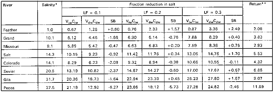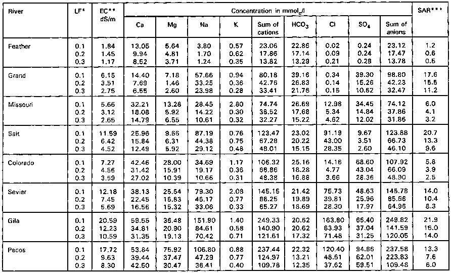 TABLE 39 Effect of reduced leaching on river salinity where highly saline groundwater of independent and constant salt composition is displaced into the river with low and high leaching, simulating Grand Valley, Colorado, conditions (after Rhoades and Suarez 1977)