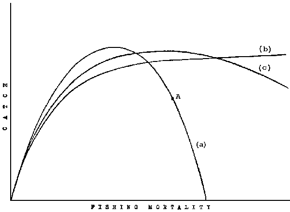 For fisheries with a type (a) yield curve there can be large benefits if the stock is over-fished (e.g. at point A) by restricting fishing and thus increasing the catch: these benefits will occur whether or not the reduction of the amount of fishing allows a reduction in the costs of fishing. In type (b) curves there can be no increase in catch, but there may still be benefits, possibly considerable, if costs can be reduced.
