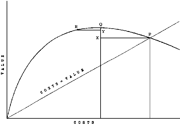 A curve relating costs to value, such as Figure 2, can then be derived. Also shown in Figure 2, is the line of equal costs and value. In the absence of regulation fishing will tend to stabilize at the point P where the line outs the curve.1/ If in the example of Figure 2, fishing is reduced to give the maximum catch, point Q, then there will be some benefit from the increased catch (QX), but there will also be a benefit (PX) from reduced costs - provided the efficiency is not altered. Often, as in the figure, this benefit can be greater than that from increased catch. Also, if the fishing is further reduced, say to R, then the further reduction in costs (RY) is possible which will be considerably greater than the reduction in value (QY). For fixed economic conditions a point giving the maximum net economic return (value less costs) can be defined. Since economic conditions do vary this point is not absolutely fixed, and cannot be used as the uniquely definable objective of fishery management in place of the objective of maximum physical yield which also has both biological and economic shortcomings (Gulland 1968). However it will always be true that in all situations (with a few trivial exceptions) it is desirable on economic grounds to fish at less than the rate giving the maximum physical yield.