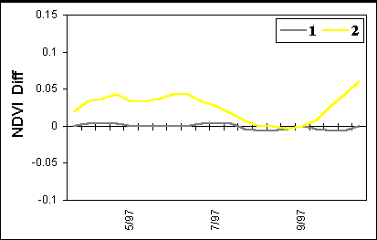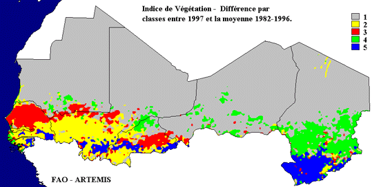 Indice de végétation - Différence par classes entre 1997 et la moyenne 1982-1996