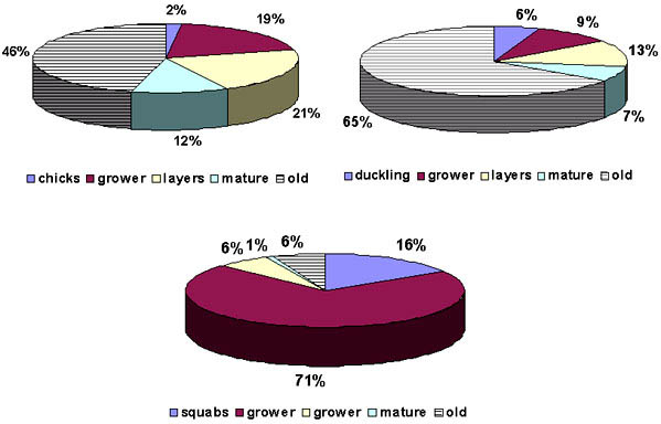 Distribution of flocks by age groups was in favour of old birds (over 52 weeks) in chickens and ducks and growers (20-30 weeks) in pigeons. This showed that farmers keep their birds for a long time. The proportion of chicks and ducklings less than ten weeks old was small. This suggests high mortality rates caused by diseases and predators. This age group is vulnerable and needs care. In pigeons the number of squabs is low since this is the group that is mostly consumed. Growers, mature and old pigeons are used for breeding. Inbreeding within flocks is probably occurring because of the lack of a cockerel-exchange system and record-keeping.