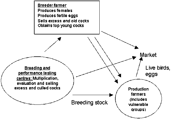 The organization of an open-nucleus breeding system for rural poultry is outlined in Figure 2. Production farmers will obtain superior breed stock from breeder farmers and from the breeding centres. Breeders will obtain top young evaluated cockerels from the breeding centres.