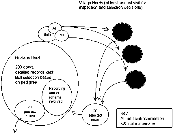 Following the principles of a nucleus breeding programme, as schematically presented in Figure 1, sires would be selected from the scheme. Female animals would have to be selected from production farms (large or small scale) to be part of the selected population. These dams would stay in their original herds, where they would continue to produce. The production herds would remain separate and a record-keeping system would be established for them that would be used in testing young animals.