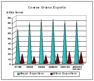 Despite contracting global trade, coarse grain exports in 2001/02 (July/June) from the United States, the world's largest exporter, are seen to increase by about 2 million tonnes from the previous season. Australia is also expected to have another successful export campaign this season, given its large barley supplies and strong international demand for malting barley. However, as with wheat, a number of unexpected developments have also emerged in the coarse grain market this season: Canada, a major coarse grain exporter, is expected to import a record maize volume of about 3 million tonnes, to compensate for the decline in its overall 2001 coarse grain production; the EC has turned into a big barley importer this season while its global market share as a leading barley exporter dropped sharply; maize exports from Argentina have suffered not only from lower domestic output but also the adverse impacts of uncertainties regarding the country’s trade policy. Following smaller maize production, South Africa, the most prominent coarse grain exporter in Africa, has greatly reduced its maize exports as well. On the other hand, for most of the current season, China has continued to surprise the market by making large maize sales. Brazil has turned into a major maize exporter, supported by large domestic supplies and a strong international demand for non-GMO Brazilian maize. A bumper maize harvest in Hungary and an upsurge in barley output in the Russian Federation and Ukraine have also contributed to higher exports from those countries.