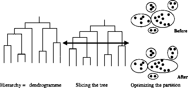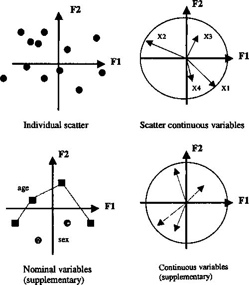 These methods, which are based primarily on a geometrical approach, make it possible to measure the resemblance, or the distance, between individuals and between variables, and to establish their degree of similarity. These similarities are visualized either by plotting a "cloud" of individuals (or variables) on a factorial plot, or by the shape of a dichotomous tree (dendrogram), whose success junctions illustrate the grouping of individuals. By slicing across the tree, the total population of the individuals under analysis can be partitioned, and interpreted according to the variables that are used in the analysis (active variables) and to the variables that are external to the analysis (additional variables). These partitioned groups, when interpreted, constitute the result of the typological profile: namely, the identification and the description of the elements within the various classes.